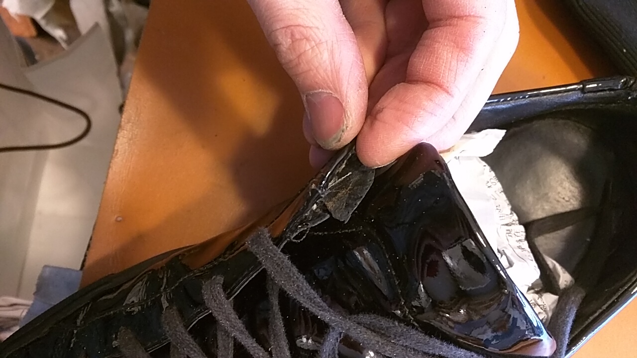 ちょっとわかりづらいですが、靴紐の一番上の穴が、裂けて紐が通せなくなってしまいました。